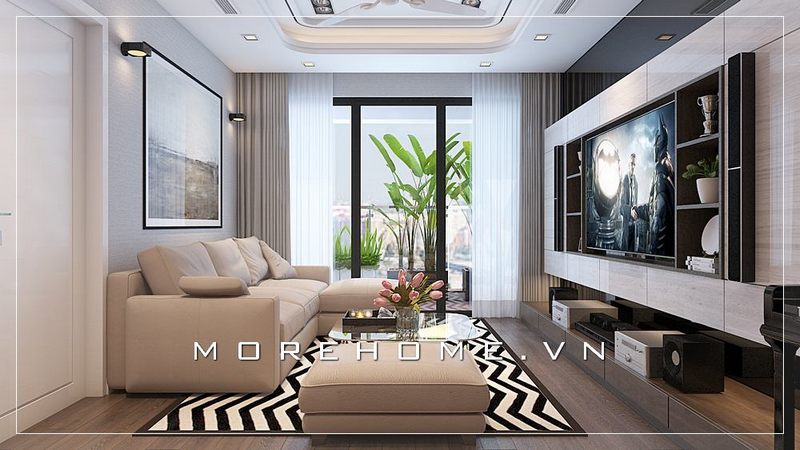 Kệ TV làm từ gỗ công nghiệp an cường màu sắc ấm áp, thiết kế hiện đại, góp phần mang đến diện mạo mới mẻ cho căn hộ chung cư.